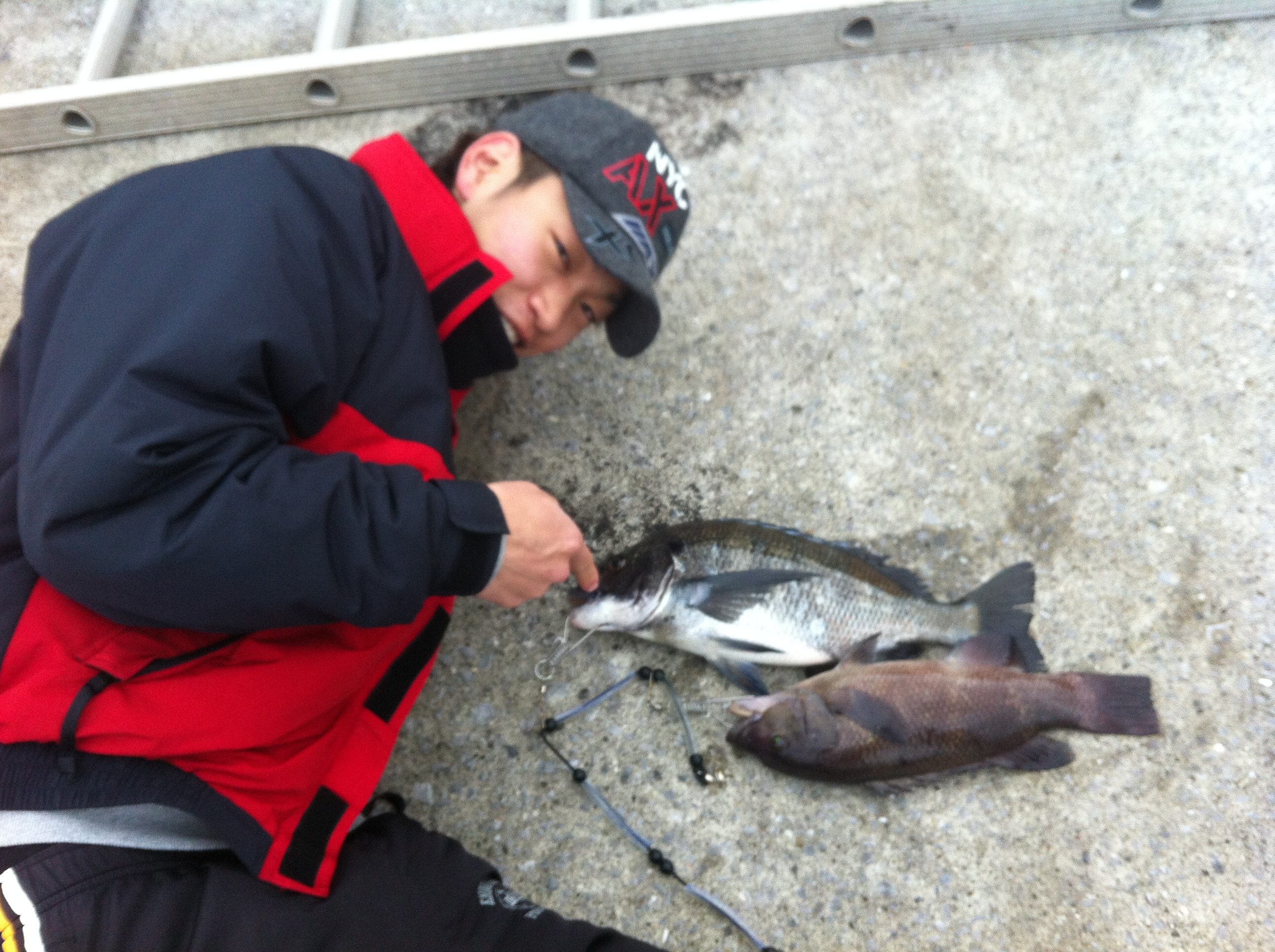 順次が2投目くらいで人生初めてのカンダイを釣りあげ、ちょっとあせる中村。